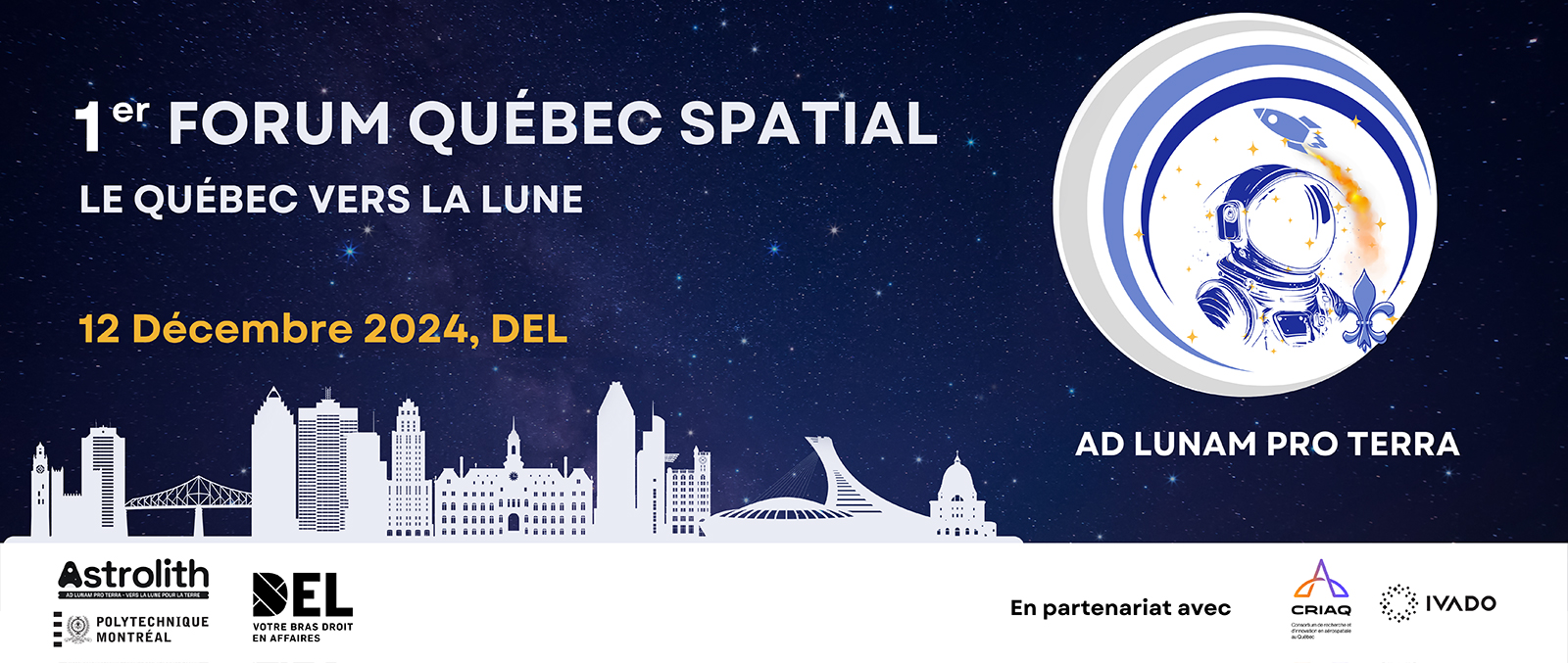 Les 11 et 12 décembre prochains se déroulera le premier Forum Québec Spatial – Le Québec vers la Lune, organisé par Polytechnique Montréal, l'unité de recherche transdisciplinaire du génie des ressources et des infrastructures spatiales (ASTROLITH) et DEL - Développement économique de l'agglomération de Longueuil.