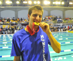 The 20-year-old athlete from Longueuil was a crowd favourite over the three-day competition. Despite the pressure he faced at the CEPSUM pool, he had his best moment during the second day's 200-metre breaststroke. After leading the race from beginning to end, his time, 2:10.09, earned him the top step on the podium, ahead of Jason Block of the University of Calgary Dinos, who has won eight of the last nine breaststroke competitions at the SIC championships since 2010. Also, Frédéric's time set a record for both the Carabins and the RSEQ.
