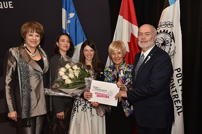From left to right: Hélène David, minister responsible for Higher Education; Nathalie Provost, Polytechnique graduate injured during the 1989 tragedy and ambassador of the Order of the White Rose; Liane Bernstein, second recipient of the Order of the White Rose scholarship; Michèle Thibodeau-DeGuire, Principal and Chair of the Polytechnique Board of Directors, and Chair of the Order of the White Rose scholarship selection jury; Christophe Guy, CEO of Polytechnique.