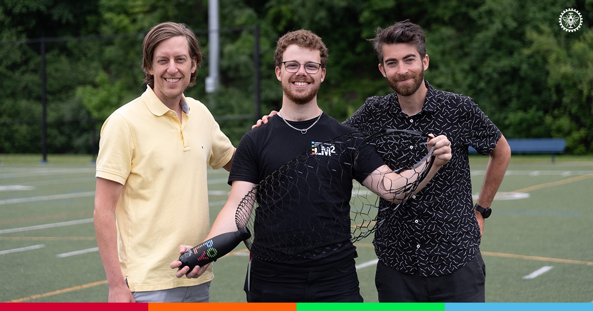 Frédérick Gosselin, Danick Lamoureux and David Mélançon with a prototype of their kirigami-patterned plastic parachute. (Photo credit: LM2)
