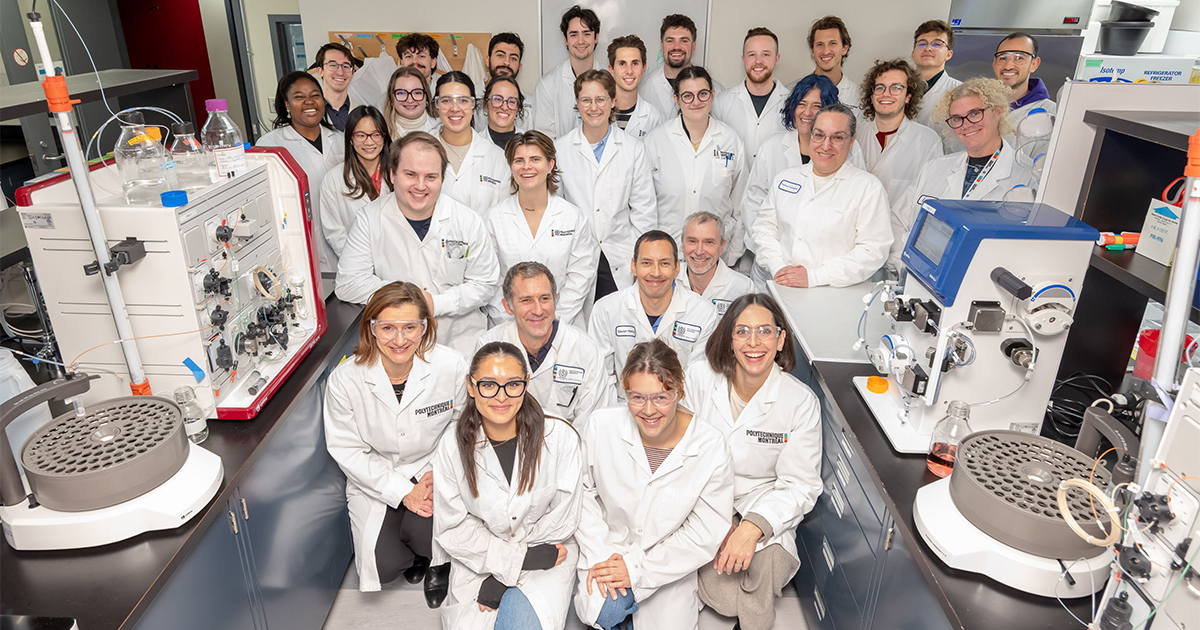 Les étudiants et étudiantes de la première cohorte de la concentration biofabrication, accompagnés de leurs professeurs, du personnel technique et des membres de la haute direction de Polytechnique – Marie-Lou Robillard, coordonnatrice en gestion administrative et financière, Lydia Simard, technicienne, Hélène L’Écuyer-Coelho, professionnelle de recherche, Maud Cohen, directrice générale, Gregory De Crescenzo, professeur titulaire au Département de génie chimique et co-directeur de l’initiative RAMP-UP, Olivier Henry, professeur titulaire au Département de génie chimique et coordinateur de la concentration en biofabrication, Mario Jolicoeur, professeur et directeur par intérim du Département de génie chimique, et Valérie Bélisle, directrice de la philanthropie et des relations avec la communauté diplômée (Photo : Owen Egan)