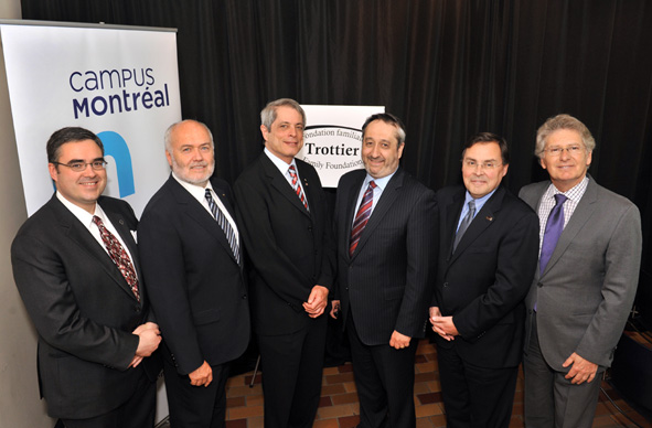 De gauche à droite: Miguel Anjos, directeur intérimaire de l'Institut de l'énergie Trottier, Polytechnique Montréal, Christophe Guy, directeur général, Polytechnique Montréal, Lorne M. Trottier, cofondateur de l'entreprise Matrox et président de la Fondation familiale Trottier, Michel Patry, directeur de HEC Montréal, Guy Breton, recteur de l'Université de Montréal, John Parisella, directeur exécutif de la grande campagne de financement Campus Montréal.