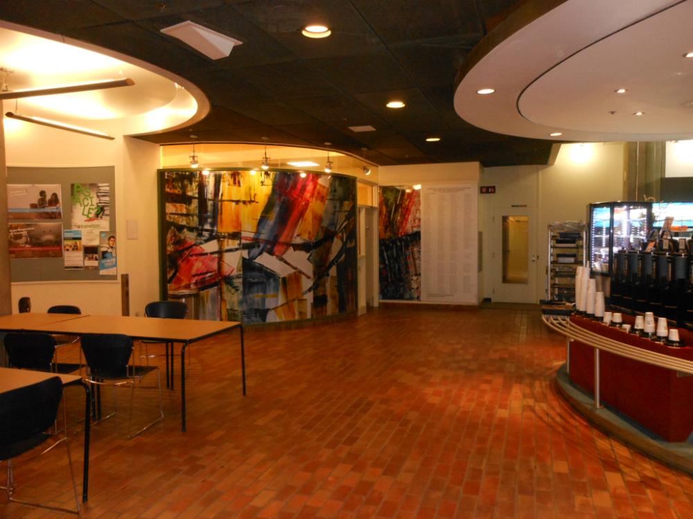 Maintenant : la vitrine étudiante et ses lamelles de bois, en forme de vagues