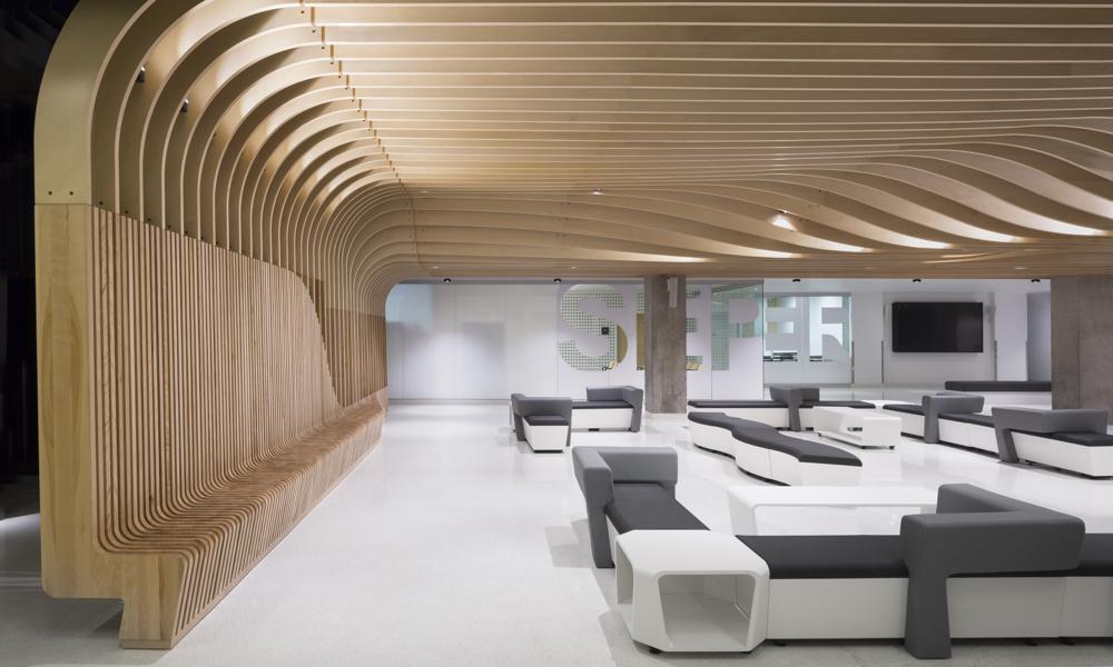 Ce projet est innovateur en matière de procédés, notamment par la réalisation des pièces de bois à partir d’un modèle 3D directement envoyé sur des découpes robots. Ces pièces fabriquées à la machine renforcent en effet le vibrant design et la dimension organique de la structure.
