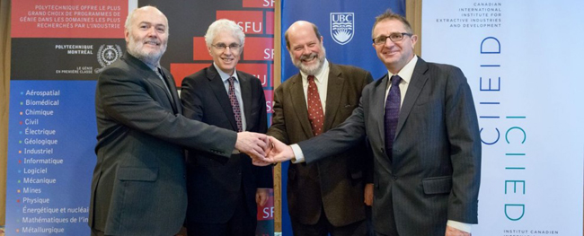 L'Institut canadien international pour les industries extractives et le développement (ICIIED) est une coalition réunissant l'Université de la Colombie-Britannique (UBC), l'Université Simon Fraser (SFU) et l'École Polytechnique de Montréal (EPM). Pour l'inauguration, M. John Hepburn, vice-président, Recherche et relations internationales, UBC, M. Andrew Petter, président, SFU, et M. Christophe Guy, directeur général, EPM, se sont joints à M. Bern Klein, directeur exécutif intérimaire de l'Institut.