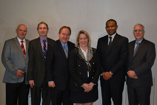 De gauche à droite : M. Ghislain Rivard, conseiller senior, Bureau des relations internationales (BRIN), M. Richard Simon, professeur agrégé, Département des génies civil, géologique et des mines, 1er cycle, tous deux de Polytechnique Montréal, M. Louis de Lorimier, ambassadeur du Canada au Mali, Mme Line Dubé, directrice du Bureau des relations internationales (BRIN), également de Polytechnique, Dr Boubou Cissé, ministre des Mines du Mali, et M. Daniel Dumas, directeur exécutif de l'ICIRD.