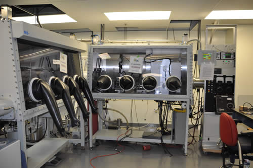 Glove box 2 hosts a probe station to be used for electrical characterizations at room temperature in N2 atmosphere. This probe station is equipped with an optical imaging system for electroluminscence imaging. Glove box 3 includes a vacuum evaporation system for organic molecular materials and metals.