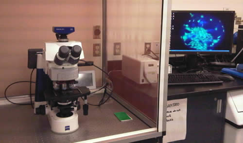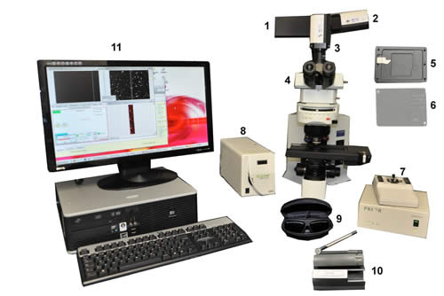 The system is composed of a Carl Zeiss upright microscope with polarization unit which permits polarized light imaging as well as fluorescence and transmission mode imaging. 10, 20, 40, 63, 100X objective lenses are available for use. The microscope is operated with a software called AxioVision Rel 4.8 from the computer. Image acquisition modules enable the user to obtain a high depth of field (Z-stack) and the use of different filters to differentiate regions with particular optical properties (multichannel fluorescence). Image analysis tools like particle analyzer, grains, topography, scaling, spectral properties are available. For a better understanding of the microscope, please refer to the following link: AxioVision.