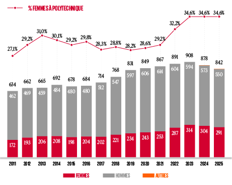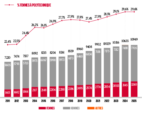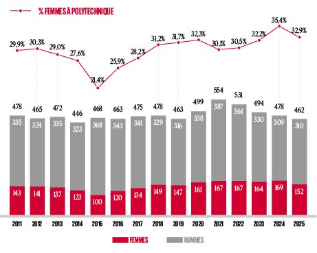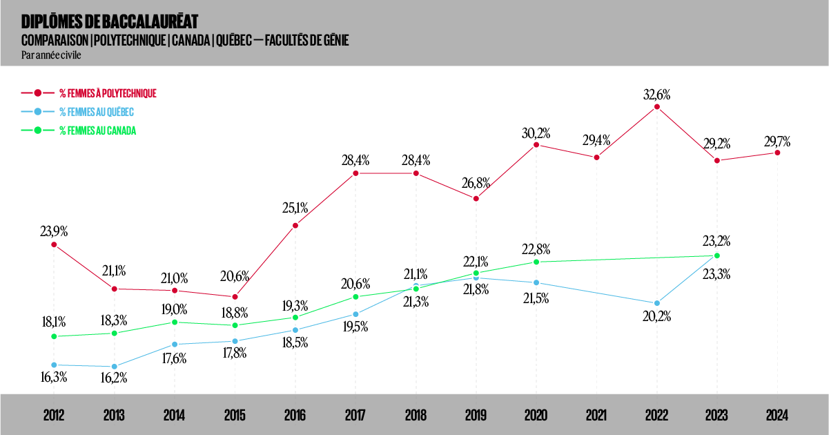 Polytechnique Montréal encourage les filles à s’intéresser aux sciences, aux technologies, à l’ingénierie et aux mathématiques (regroupées sous l’acronyme « STIM »), et s'emploie à briser les stéréotypes. Elle a participé, au fil des ans, à plusieurs initiatives visant à faire la promotion des sciences auprès des filles. Elle soutient l’épanouissement de ses étudiantes, ainsi que le développement professionnel de ses diplômées et de ses professeures. Résultat de ces actions : au cours des trois dernières décennies, Polytechnique a augmenté sa proportion d’étudiantes au point de dépasser la moyenne nationale des facultés et écoles de génie, même si cette proportion demeure moins élevée que dans d’autres domaines d’études.