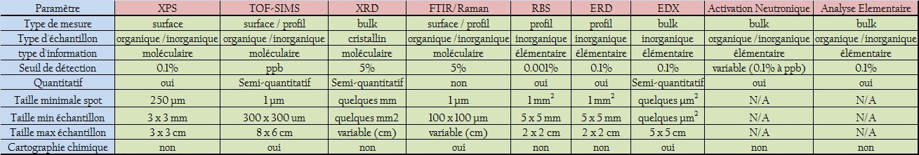 Un grand nombre de techniques d’analyses chimiques sont disponibles au GCM et chacune d’entre elle comporte des avantages et des limitations. Pour faire un choix, il convient de tenir compte des quatre facteurs fondamentaux: les matériaux analysables (organique et/ou inorganique), le type d’information obtenue (moléculaire ou élémentaire), la précision (quantitatif ou qualitatif), la limite de détection (%, ppm ou ppb) et la profondeur d’analyse (mm, microns ou nanomètres).