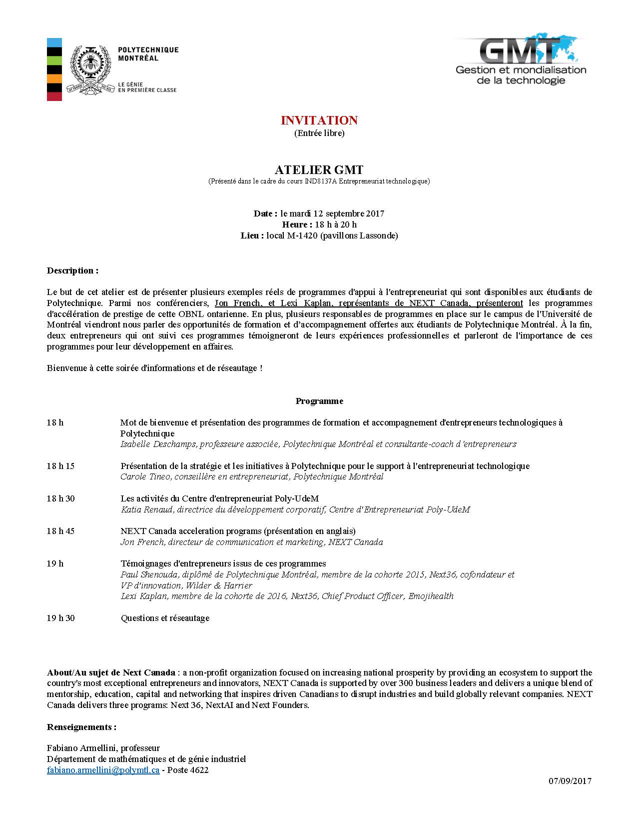 Gestion et mondialisation de la technologie GMT : Atelier entrepreneuriat technologique - Le mardi 12 septembre 2017