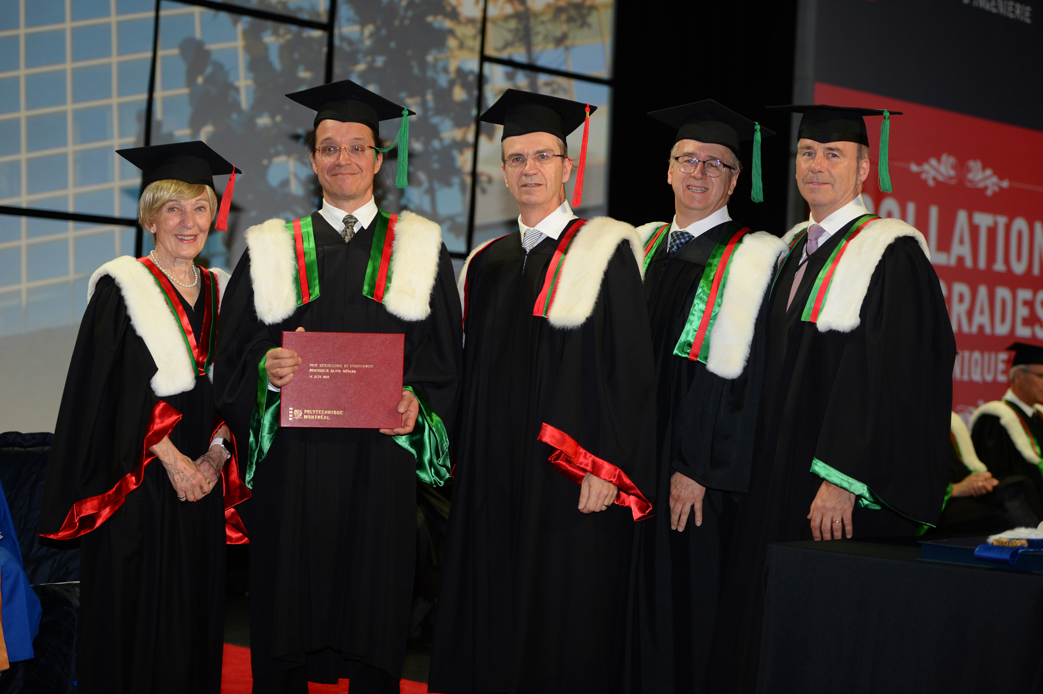 Lors de la cérémonie de remise des diplômes de Polytechnique Montréal, David Ménard, professeur au Département de génie physique de Polytechnique Montréal (2e à gauche), s'est vu remettre le Prix d’excellence en enseignement.