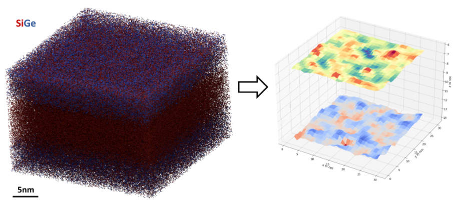 Figure: Three-dimensional point cloud of a Silicon quantum well used as a Spin Qubit embedded in Silicon-Germanium as imaged by APT (left) and the maps of the top and bottom interface of the quantum well (right). The material structure was fabricated by the Scappucci group at the TU Delft.