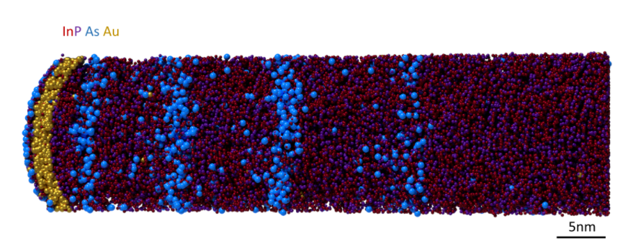 Figure: Atom Probe Tomography result of a gold catalyzed InP nanowire containing 4 InPAs quantum dots. This nanowire structure is developed for single photon sources. The nanowire was grown by the Philip Poole group at the National Research Council Canada in Ottawa.