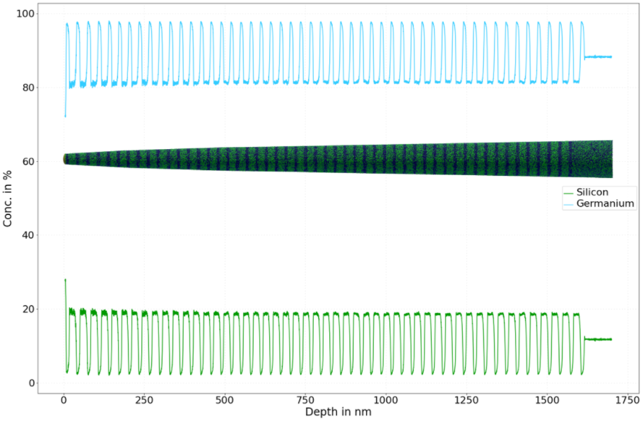 Figure: Atom Probe Tomography result of a 1.7 µm Ge/SiGe superlattice designed for quantum cascade lasing in the THz range. The sample was grown in the Moutanabbir group at Polytechnique Montreal.