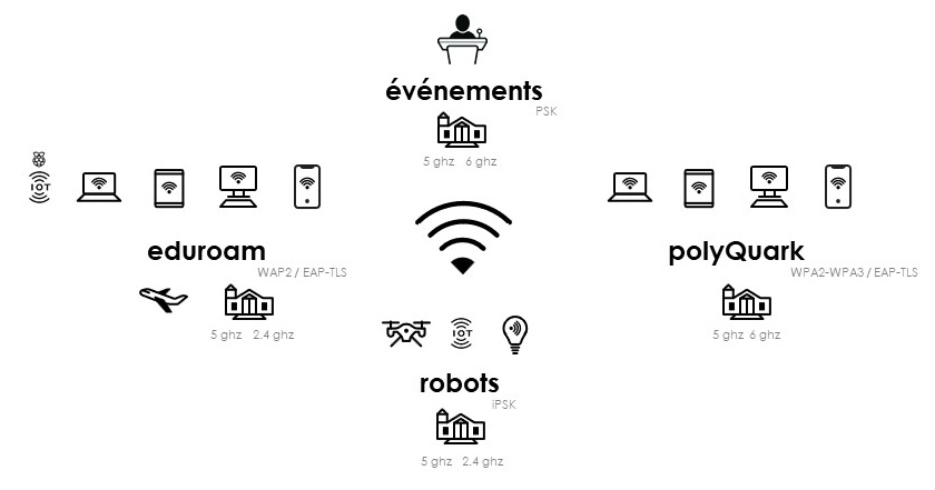 L'ensemble des pavillons de Polytechnique est couvert par un réseau sans fil (1) et un réseau avec fil.